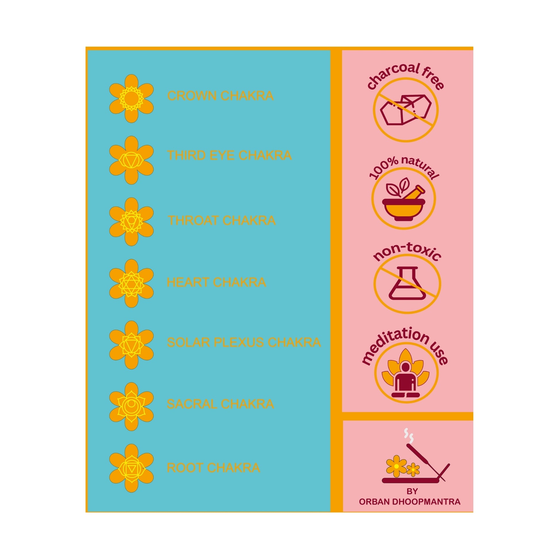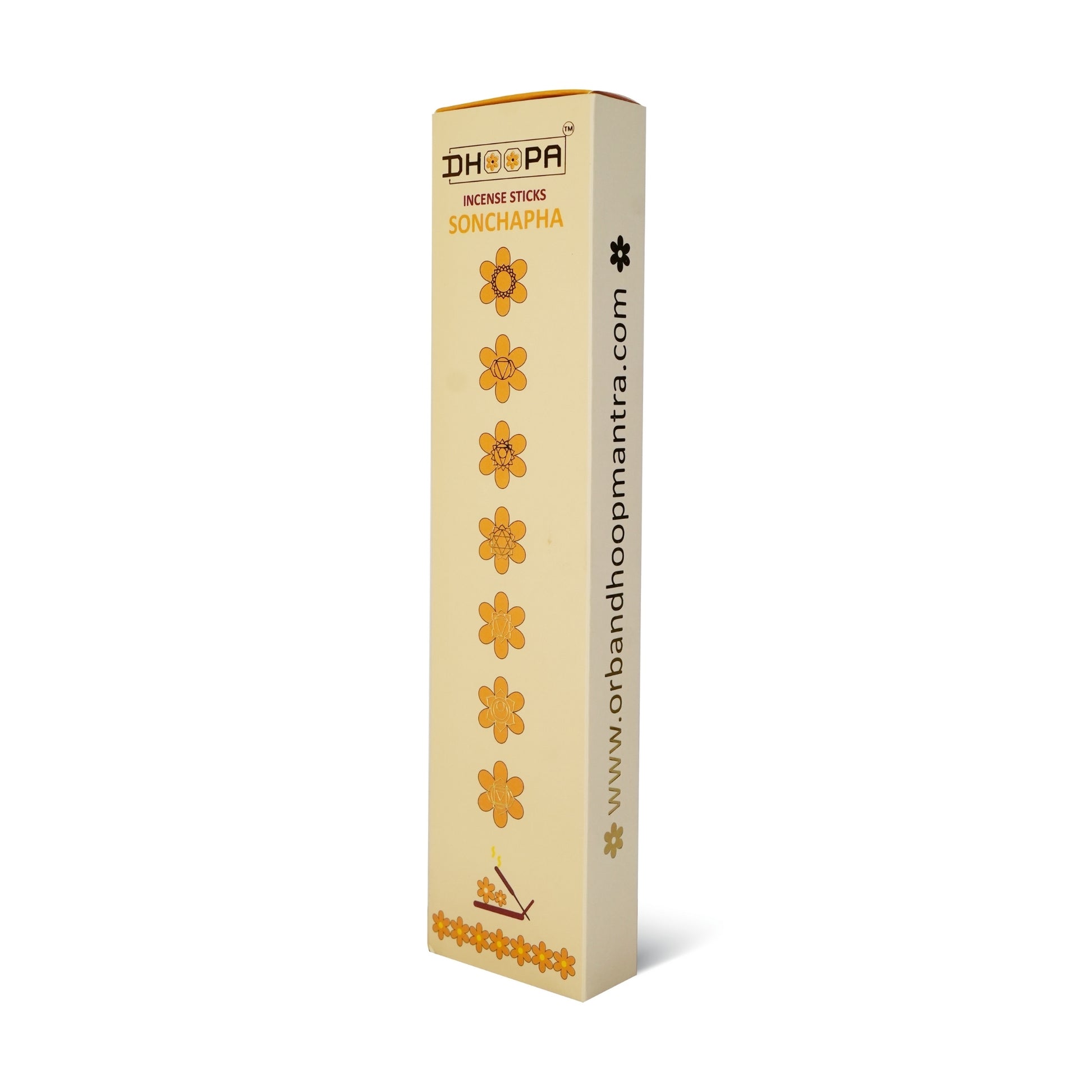 Experience the exotic and uplifting aroma of Sonchapha with DHOOPA by ORBAN DHOOPMANTRA Deluxe 7 Chakra Incense Sticks, crafted from natural ingredients and completely charcoal-free. These premium incense sticks release a refreshing, long-lasting sonchapha fragrance that fills your space with positivity, peace, and divine energy while helping align and activate your seven chakras for complete spiritual harmony. The sweet floral scent soothes the senses and refreshes the mind, making it perfect for puja, meditation, yoga, chakra healing, or everyday home fragrance. Designed for low-smoke, clean burning, Each pack contains 80 gram incense sticks, with a premium incense stick stand, and a beautiful Warli design bookmark. Blending tradition, spirituality, and craftsmanship, these deluxe incense sticks elevate your rituals and moments of serenity, making them an ideal gift for those seeking mindfulness, purity, and inner peace.