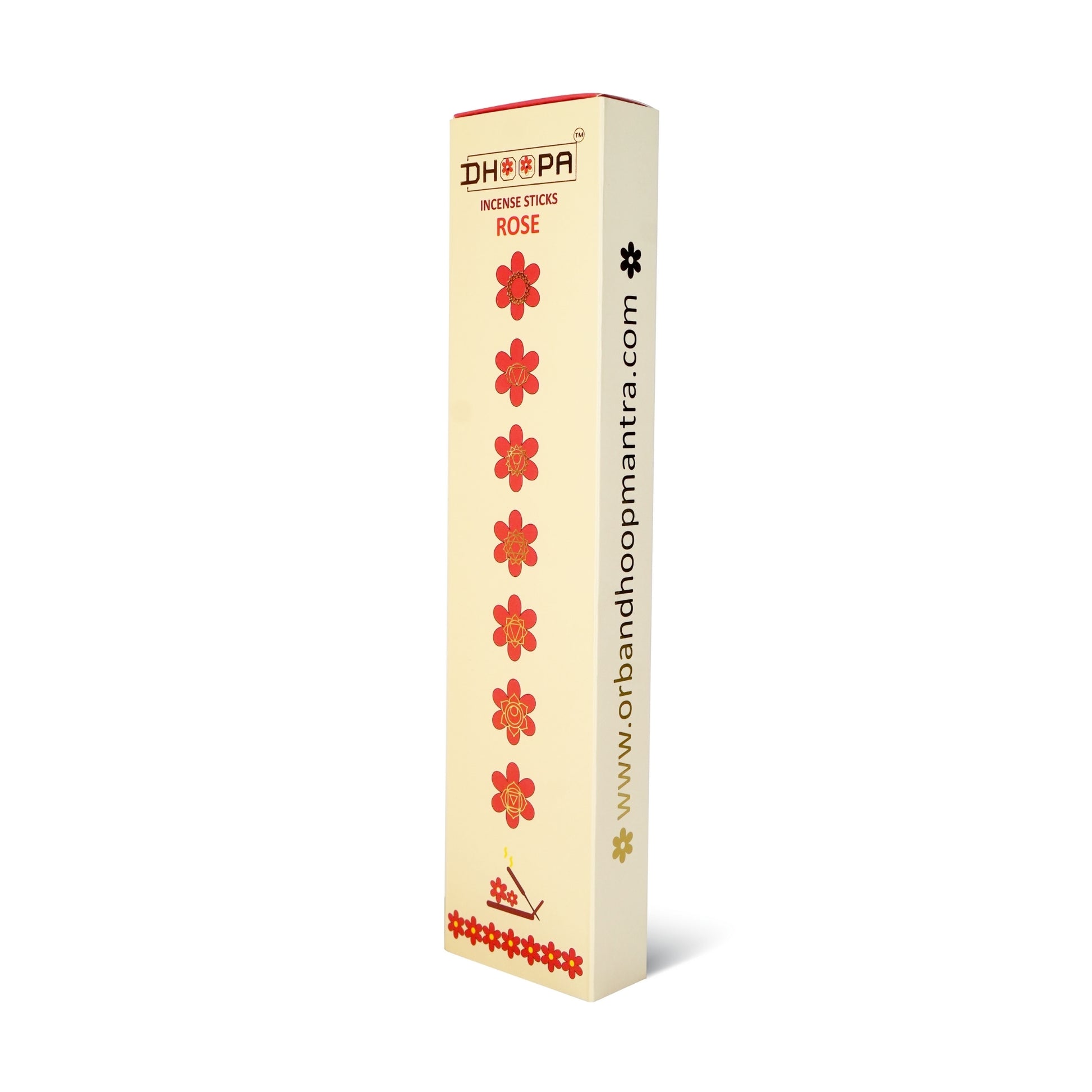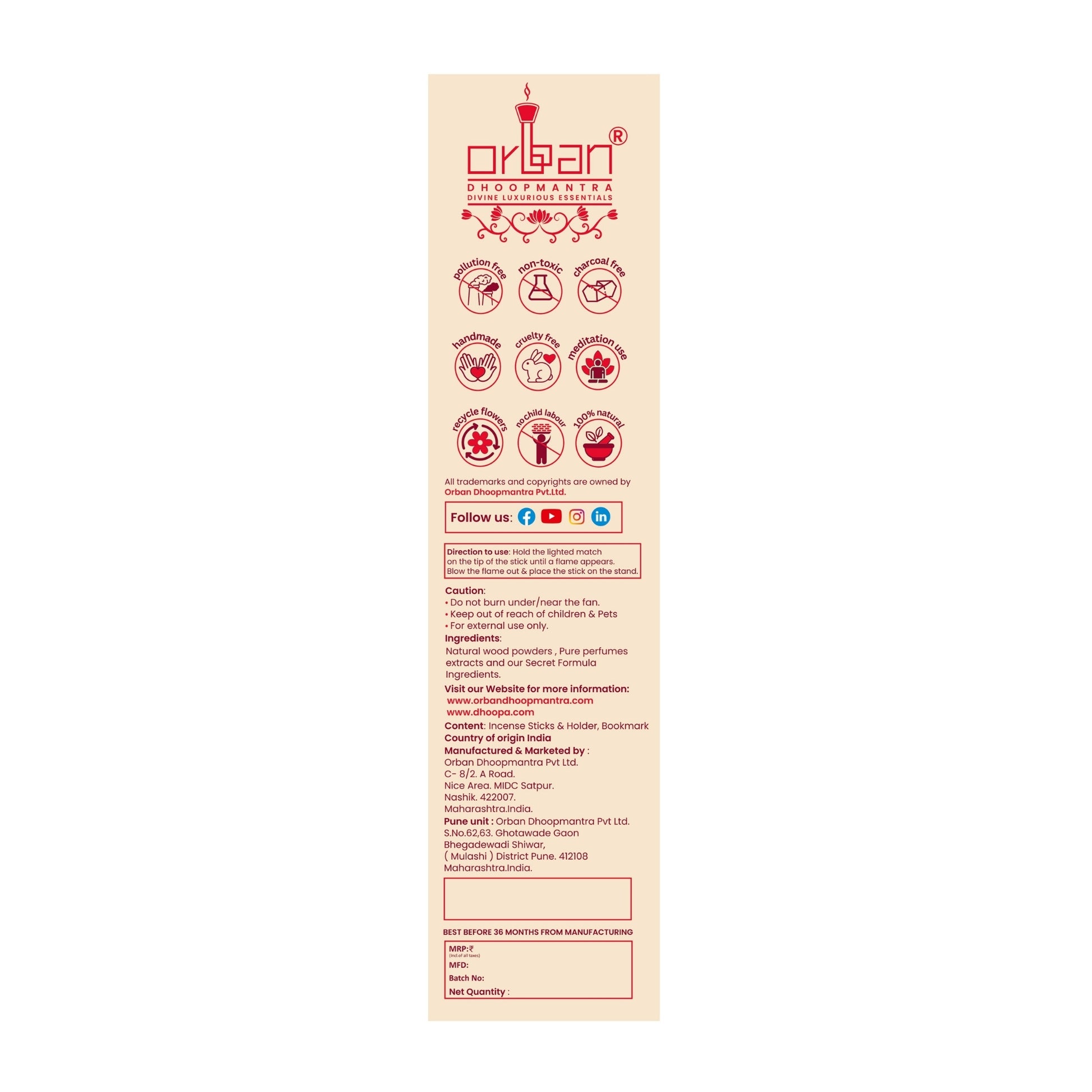 Experience the timeless and enchanting aroma of Rose with DHOOPA by ORBAN DHOOPMANTRA Deluxe 7 Chakra Incense Sticks, crafted from natural ingredients and completely charcoal-free. These premium incense sticks release a rich, long-lasting rose fragrance that fills your surroundings with love, peace, and positivity while helping align and activate your seven chakras for complete spiritual harmony. The soothing floral scent refreshes the mind and uplifts the mood, making it perfect for puja, meditation, yoga, chakra healing, or everyday home fragrance. Designed for low-smoke, clean burning, Each pack contains 80 gram incense sticks, with premium incense stick stand, and a beautiful Warli design bookmark. Blending tradition, spirituality, and craftsmanship, these deluxe incense sticks enhance your rituals and bring serenity to your space, making them an ideal gift for those seeking mindfulness, balance, and divine fragrance.
