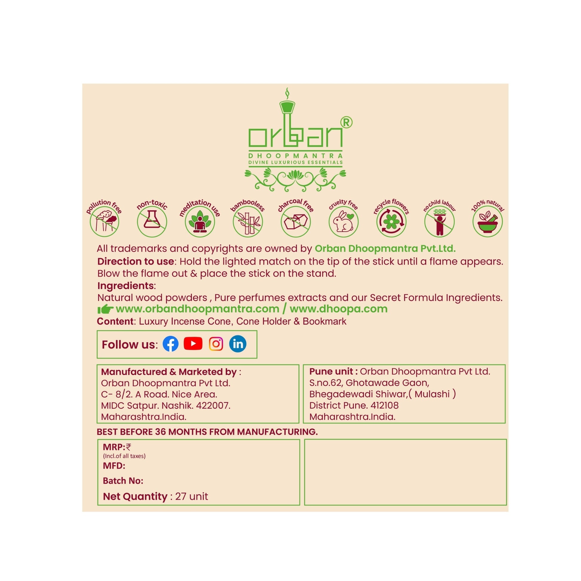 Transform your space with ORBAN DHOOPMANTRA's Kewda Incense Cones, a premium collection that brings the essence of traditional Indian aromatherapy to your home. Each cone releases the enchanting fragrance of Kewda, known for its sweet, floral, and subtle woody notes that create a serene atmosphere perfect for meditation, prayer, or relaxation. Crafted with natural ingredients, these cones provide a clean, low-smoke experience that gently fills your surroundings with calming aromatics. The set includes 28 cones. carefully formulated incense cones, complemented by a convenient incense stand and an artistic Warli bookmark. Whether used for daily rituals or special occasions, these cones help create a peaceful ambiance that soothes the mind and elevates the spirit. The elegant packaging makes it an ideal gift for those who appreciate authentic Indian fragrances. Experience the pure, traditional aroma of Kewda and transform any room into a haven of tranquility with these meticulously crafted incense cones.