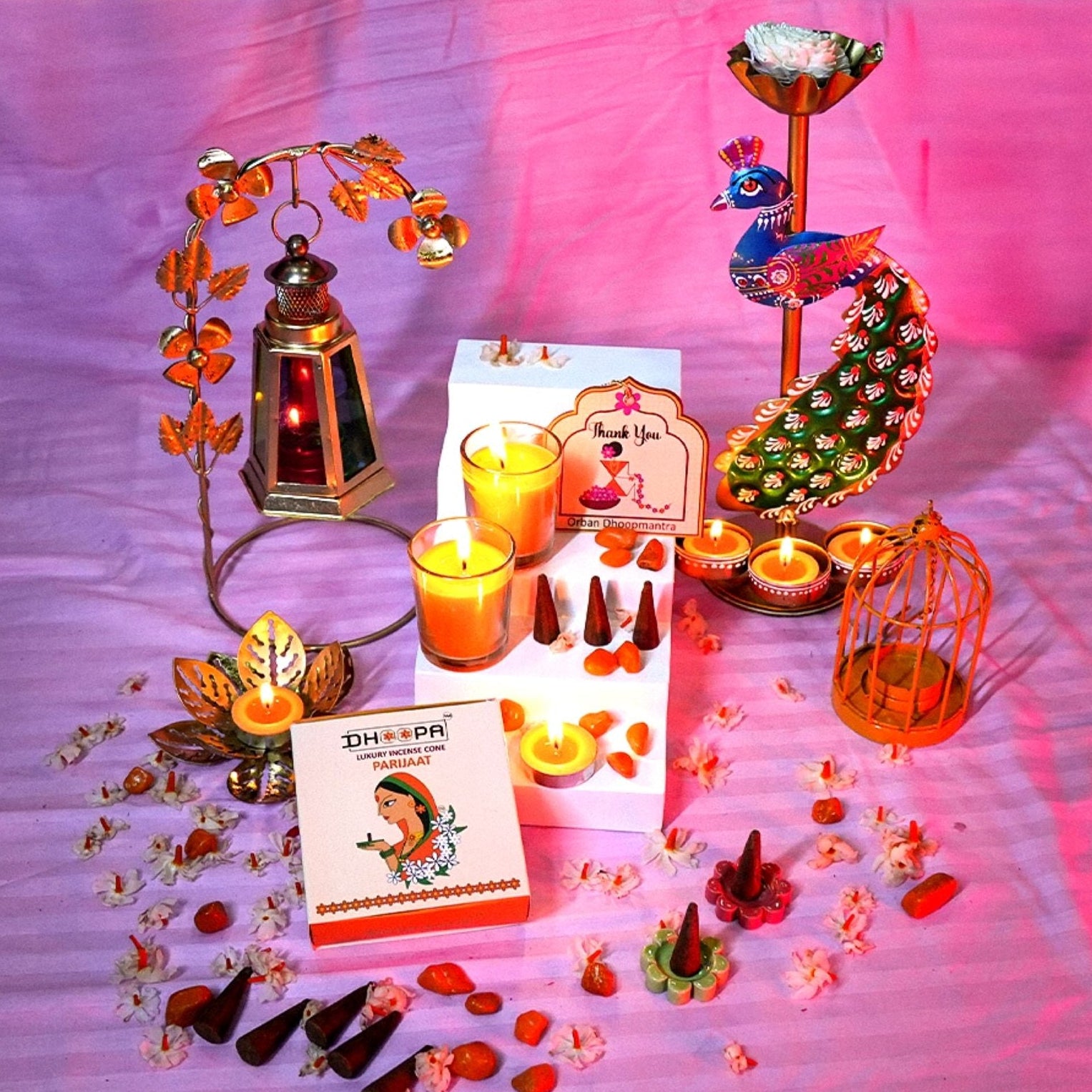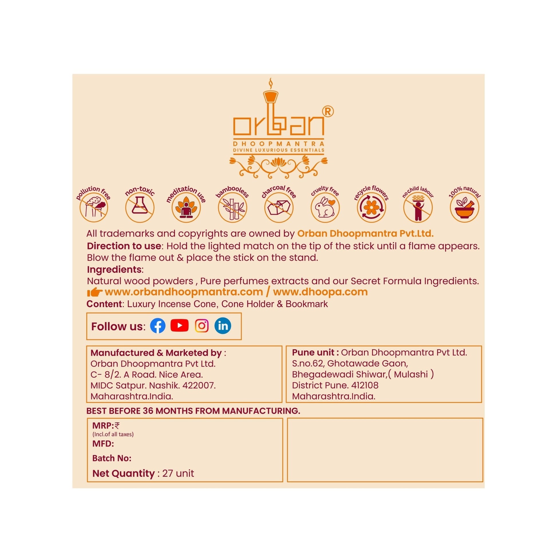Experience the divine fragrance of Parijaat with ORBAN DHOOPMANTRA incense cones. These premium cones are thoughtfully handcrafted using natural ingredients that release a sweet, floral, and refreshing aroma, creating a peaceful atmosphere in your space. The gentle fragrance helps calm the mind, reduce stress, and enhance your spiritual practices, making it perfect for pooja, meditation, or relaxation. Each cone produces minimal smoke while burning, offering a soothing sensory experience. The set includes 28 incense cones, complemented by a free incense stand and an artistic Warli bookmark, making it an ideal choice for both personal use and gifting. Whether you're seeking tranquility in your daily routine or elevating your spiritual practices, these Parijaat incense cones bring a touch of serenity and luxurious fragrance to your home.