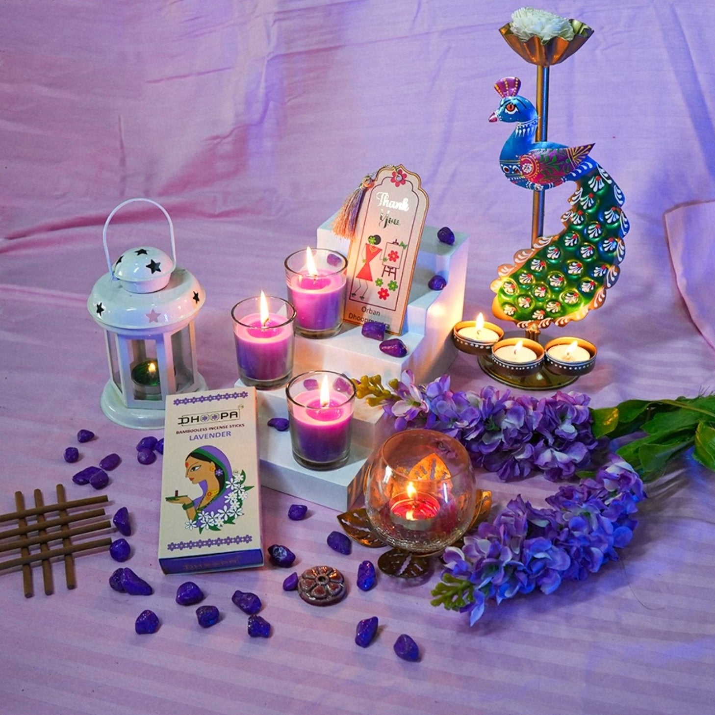 Transform your space into a haven of tranquility with DHOOPA by Orban Dhoopmantra Deluxe Dhoop Sticks in enchanting Lavender fragrance. These premium dhoop sticks are thoughtfully crafted using natural ingredients and are completely charcoal-free, offering a gentle, low-smoke burning experience. Each 10.5-centimetre stick releases a soothing lavender aroma that helps create a peaceful atmosphere—ideal for pooja, meditation, yoga, or simply unwinding at home. Each pack contains 75 gram sticks and comes with a complimentary incense stand and a beautiful Warli art bookmark. Perfect for both personal use and gifting, these dhoop sticks combine traditional wisdom with modern sensibilities to enhance your spiritual and living spaces. Experience the pure, long-lasting fragrance that helps calm the mind and uplift the spirit, making every moment of use a serene retreat.