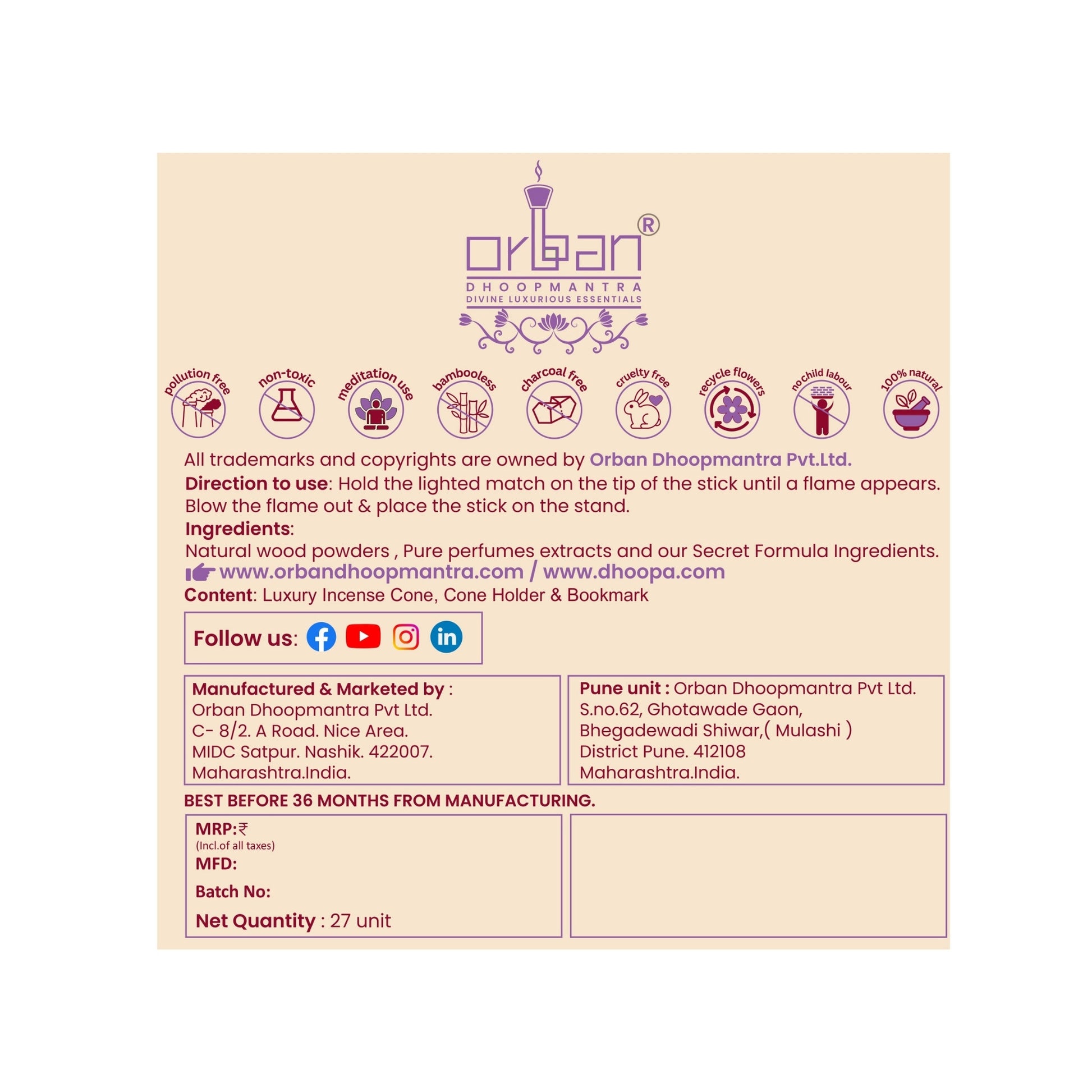 Transform your space into a haven of tranquility with ORBAN DHOOPMANTRA Lavender Incense Cones. Each cone releases a gentle, floral fragrance that soothes the mind and creates a peaceful atmosphere—ideal for meditation, yoga, or daily pooja rituals. Crafted from pure natural ingredients, these cones offer a clean, low-smoke burning experience. The set includes 28 premium incense cones, complemented by a convenient incense stand and a beautiful Warli art bookmark. The calming lavender aroma helps reduce stress and uplift your mood, making it perfect for use in homes, temples, or workspaces. The elegant packaging adds a touch of sophistication, while the long-lasting fragrance ensures your environment remains refreshingly scented throughout the day. Experience the perfect blend of tradition and modern elegance as these carefully crafted cones fill your surroundings with serenity and positive energy.
