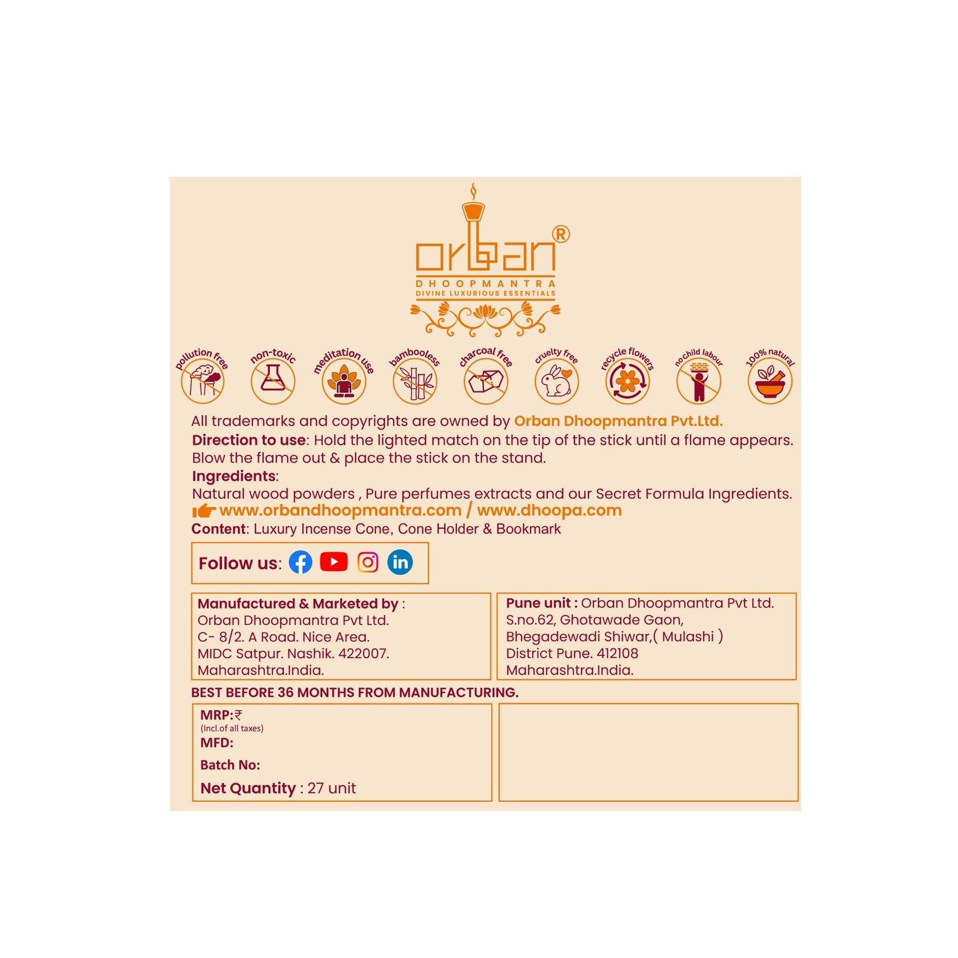 Discover tranquility with DHOOPA by ORBAN DHOOPMANTRA's Sonchapha Incense Cones, a premium collection of 28 meticulously crafted cones that bring serenity to your daily rituals. Made from pure natural ingredients, these charcoal-free cones offer a clean, low-smoke experience that gently releases the sweet, earthy fragrance of Sonchapha. Each 4-centimetre cone carries a refreshing floral essence that creates a calming atmosphere, perfect for prayers, meditation, or simply enhancing your living space. includes a complimentary incense stand and a beautiful Warli art bookmark. These thoughtfully sized cones are ideal for homes, temples, and meditation spaces, offering convenience without compromising on the authentic aromatic experience. The natural fragrance works to soothe your senses and uplift your spirit, making it an essential companion for your spiritual practices. Whether used during morning prayers or evening meditation, these incense cones help create a peaceful ambiance that transforms your surroundings into a sacred space.
